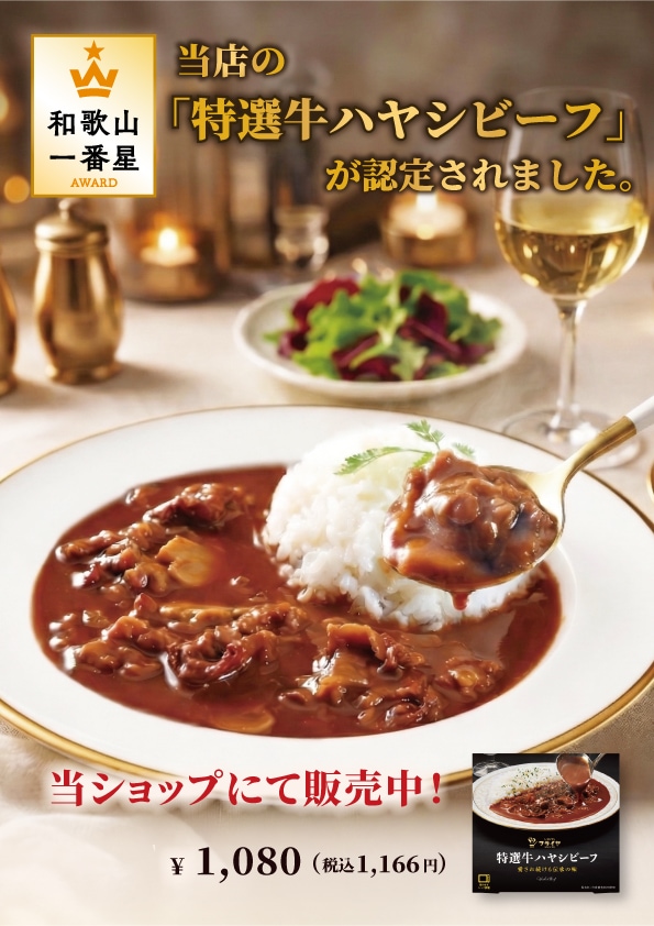 この度、和歌山一番星アワードに当店の「特選牛ハヤシビーフ」が認定されました。